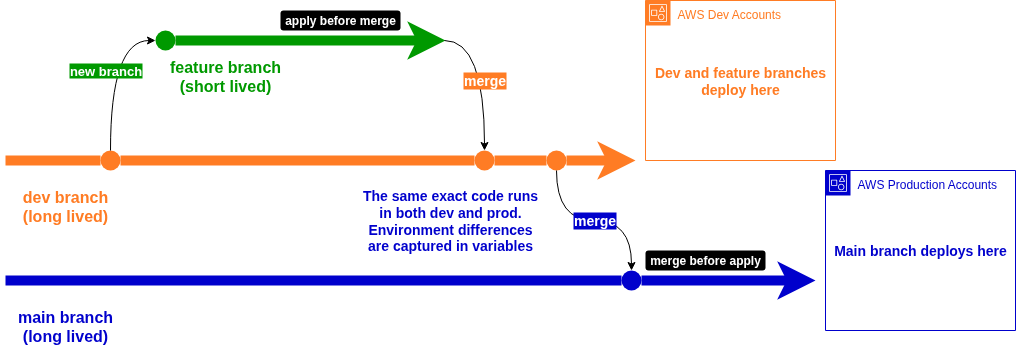 Development Branch: Points to development AWS accounts that mirror production topology (at a smaller and simpler scale) but use separate resources. This is where infrastructure changes prove themselves before graduating to production;